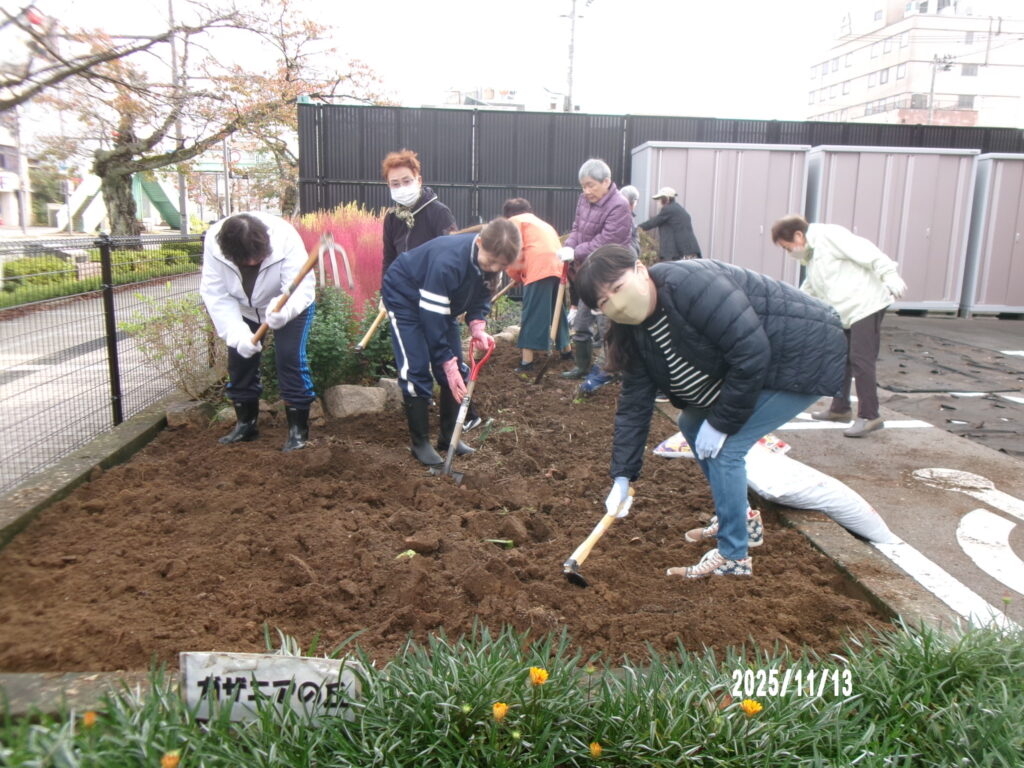 11月13日(水)、順化公民館横の「順化フラワーガーデン」にて、秋の花壇づくりを行いました。当日は肌寒い気温の中でしたが、地域の皆さまが集まり、スコップや鍬を手に土を耕し、花壇の草取りや整備作業を進めました。