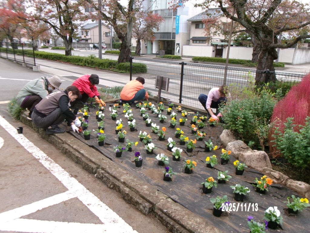 今年はパンジーやビオラ、ガーデンシクラメンなど、秋から冬にかけて長く楽しめる花々を植え付けました。植え込み作業を協力しながら進めたことで、花壇全体が明るく色鮮やかになりました。